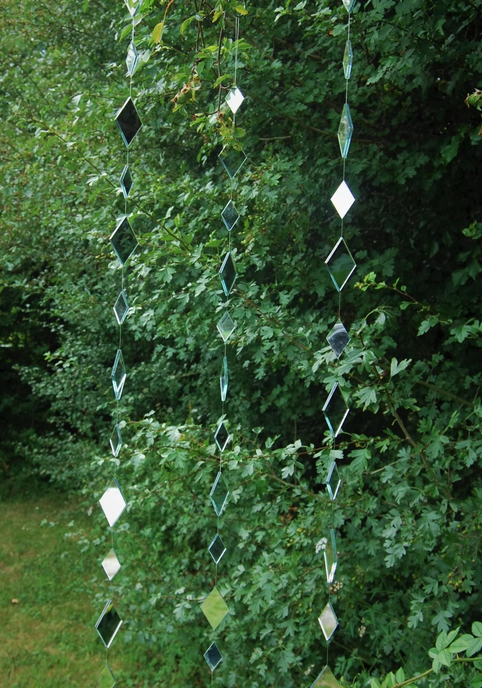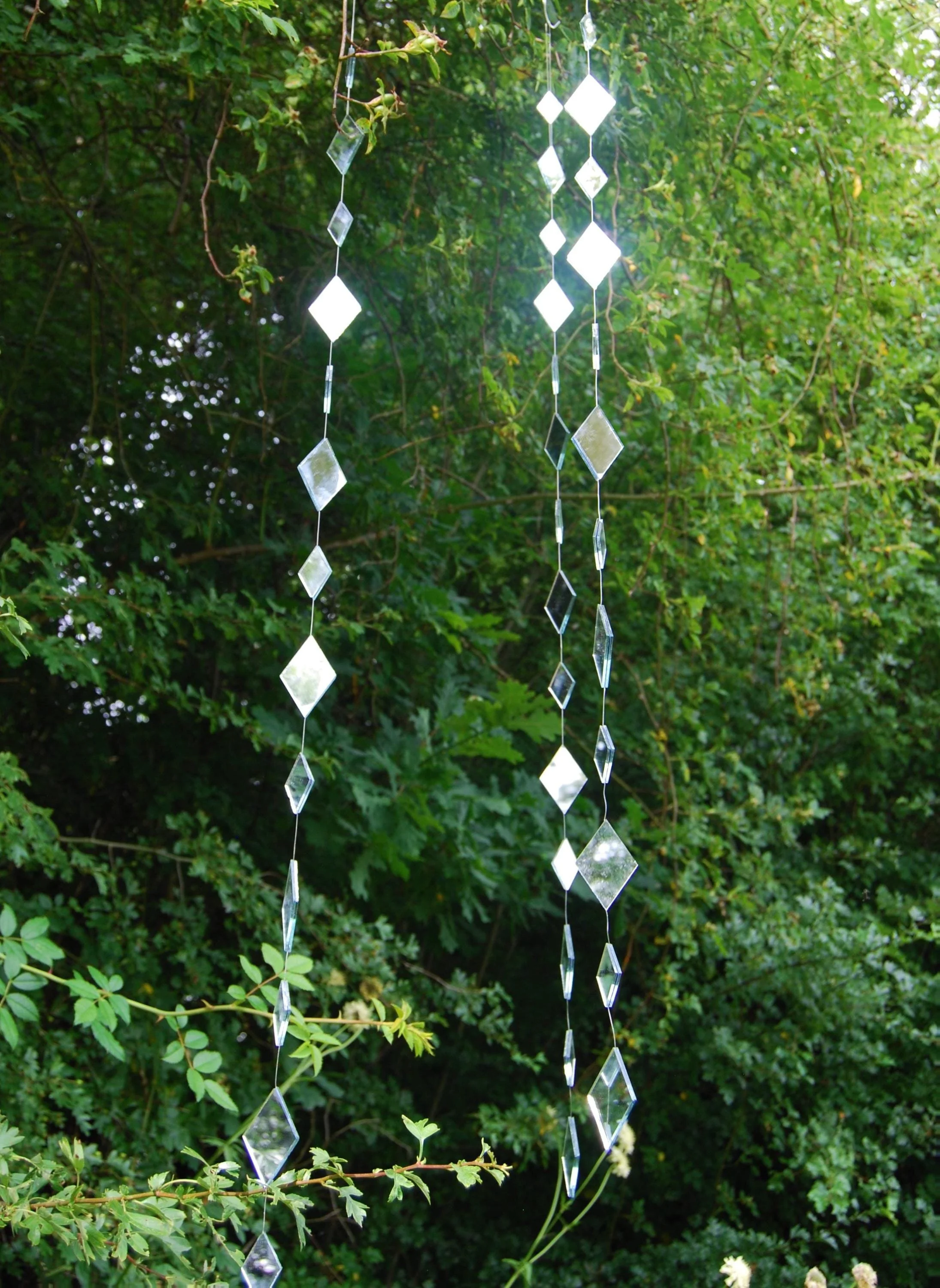When hung, this pretty string of glass mirror light catchers reflects the light beautifully. This beautiful garland can be used indoor or out and looks particularly beautiful hung from trees or large plants indoors. They look very pretty when multiple strands are hung together, as in the photo.