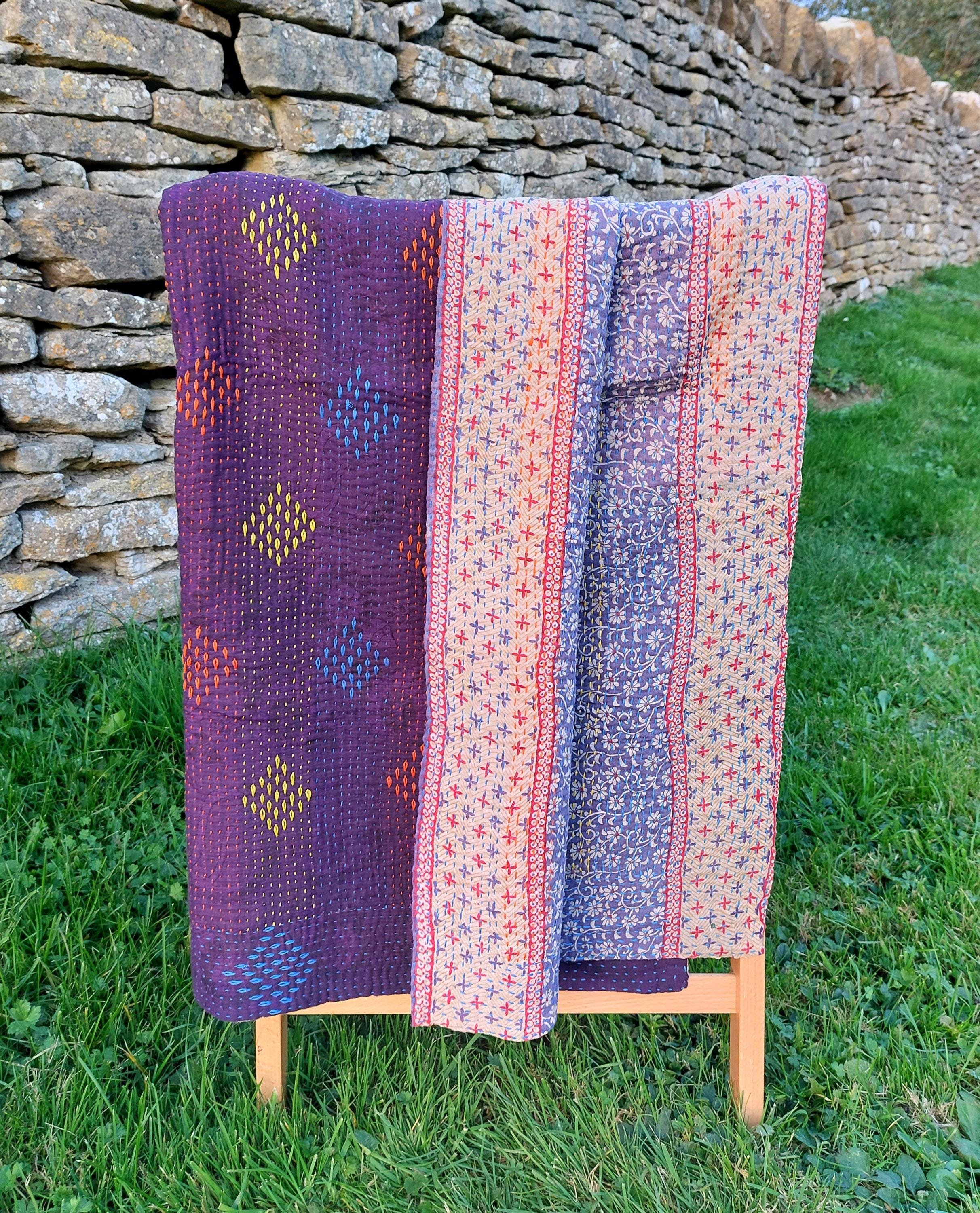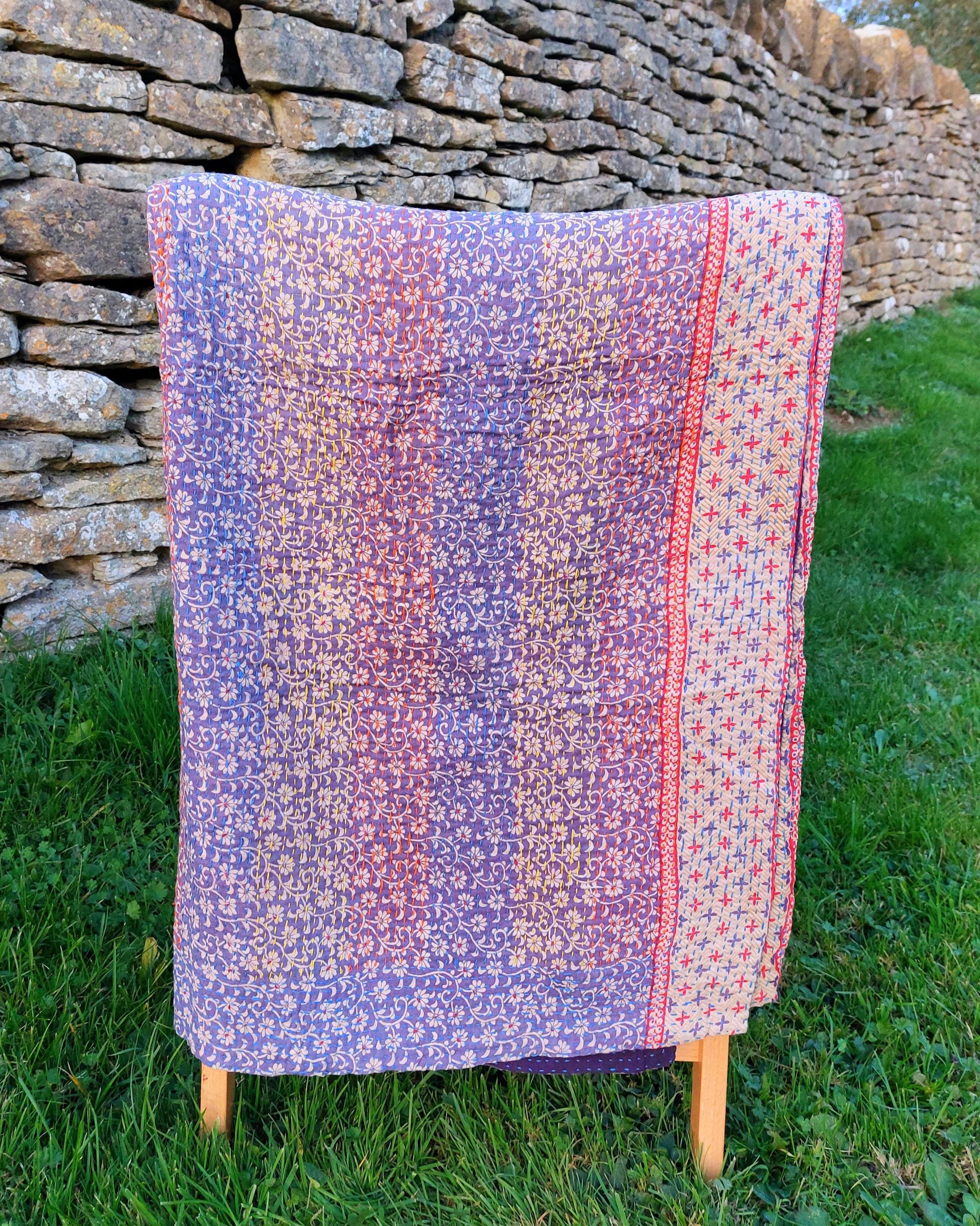 ❃ The word 'kantha' means 'patched cloth' and skilful repairs simply enhance the vintage character of this quilt. All our quilts are perfectly imperfect, with subtle variations and patches that celebrate their handmade nature. Our vintage kantha quilts are handcrafted from vintage textiles which have lived a full life before becoming a kantha quilt.