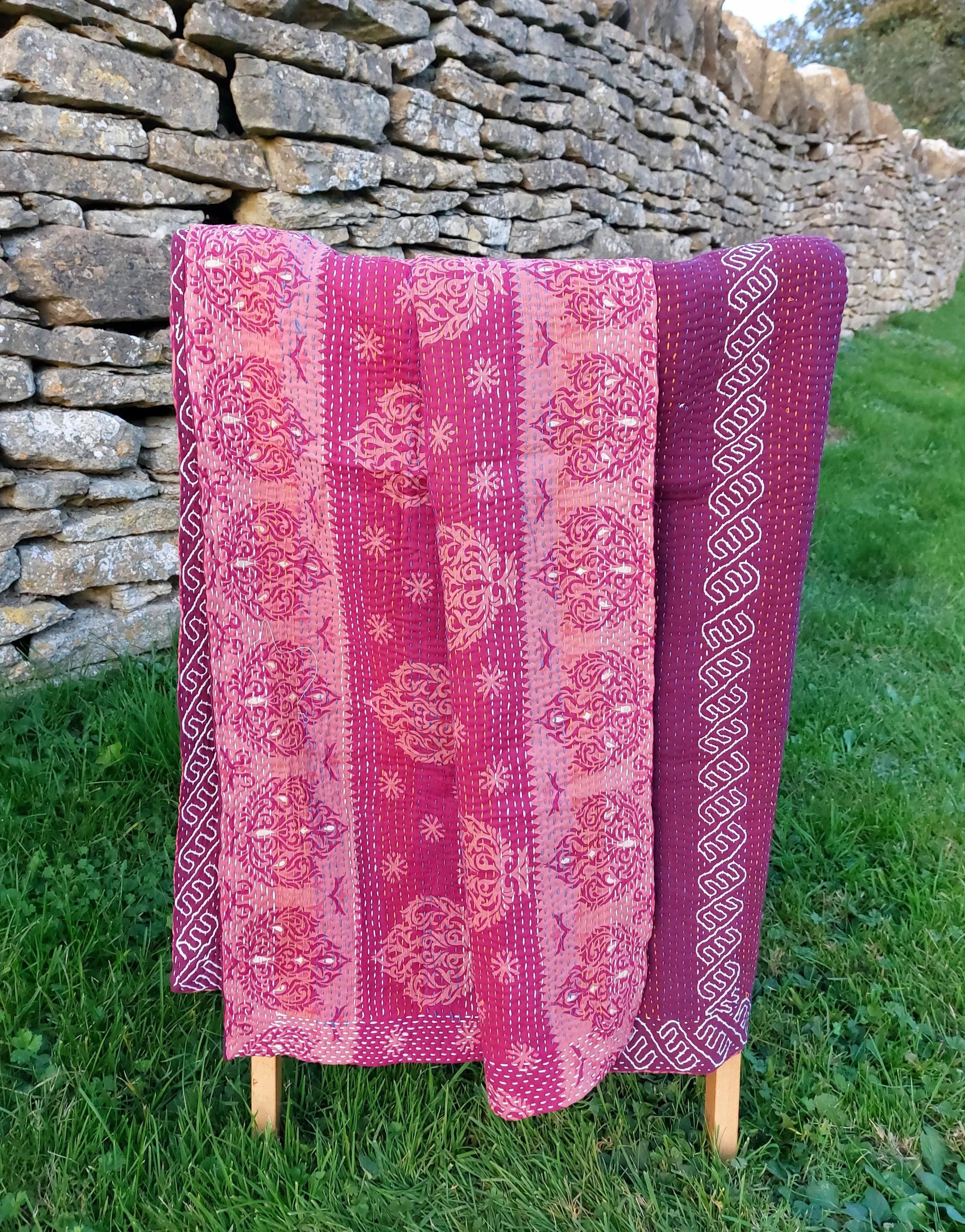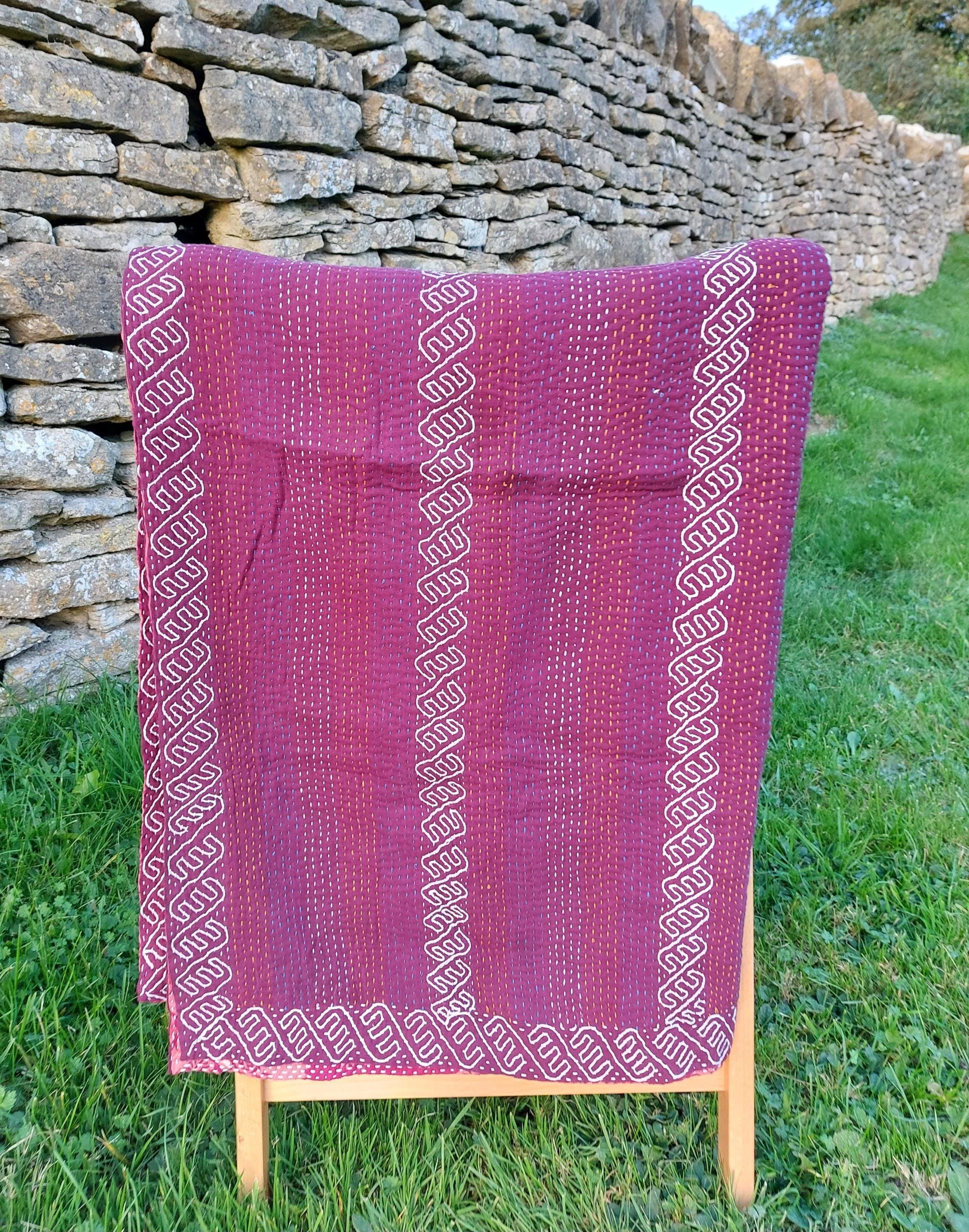 ❃ The word 'kantha' means 'patched cloth' and skilful repairs simply enhance the vintage character of this quilt. All our quilts are perfectly imperfect, with subtle variations and patches that celebrate their handmade nature. Our vintage kantha quilts are handcrafted from vintage textiles which have lived a full life before becoming a kantha quilt.