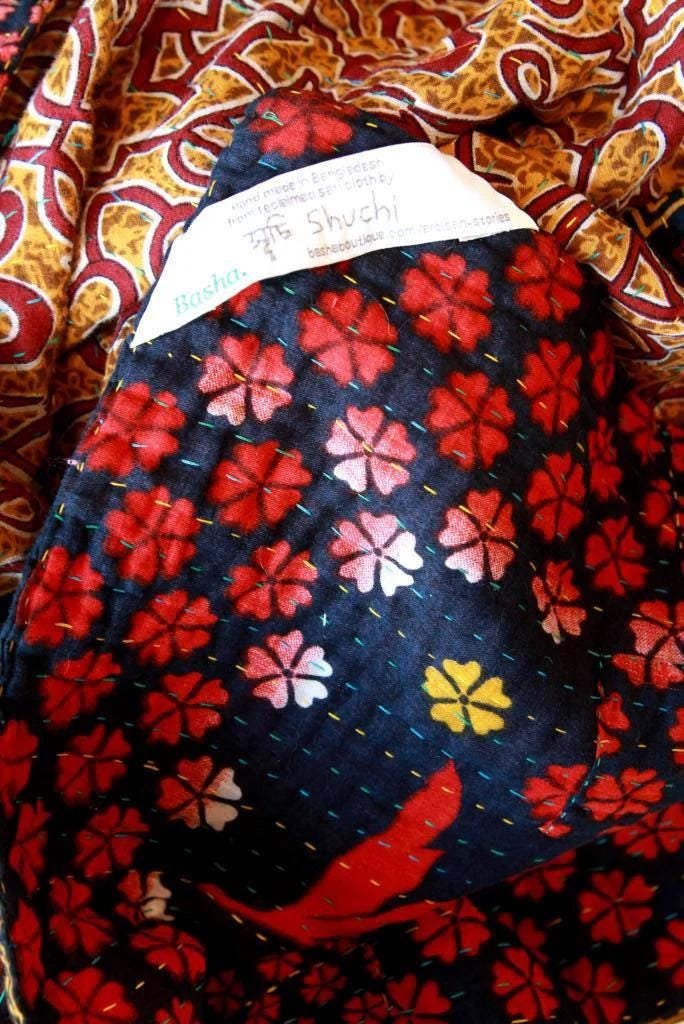 ❃ Our kantha quilts are six layers of vintage sari, hand-sewn together by women in Bangladesh using a traditional kantha stitch. Time softened sari cotton creates a lightly-quilted, cosy feel. ❃ A true ethical beauty, being fairtrade, sustainable and upcycled. ❃ Handmade from 100% upcycled cotton sari cloth. The cloth used in our kanthas is re-purposed, which means no new dyes or inks, no by-products of production; the only factory-produced supplies we use are thread. ❃ The word 'kantha' means 'patched cloth' and skilful repairs simply enhance the vintage character of this quilt. ❃ Our large throws are approximately double sized: 2 m x 2 m (6'8" x 6'8") and weigh 1.7 kg. ❃ Our kantha quilts are machine washable (and in fact get softer over more time & use). ❃ This quilt is double-sided and features two different patterns.. two quilts in one! ❃ Each kantha is one-of-a-kind with it’s own unique variations and each one features the hand-stitched name of the woman who made it. This quilt was handmade by Shuchi. ❃ These are beautiful heirloom pieces which provide freedom and opportunity to the women who hand crafted your kantha quilt. Handmade by women who were previously trafficked into or otherwise engaged in formal or floating sex work, now employed in work that brings dignity & livelihood.
